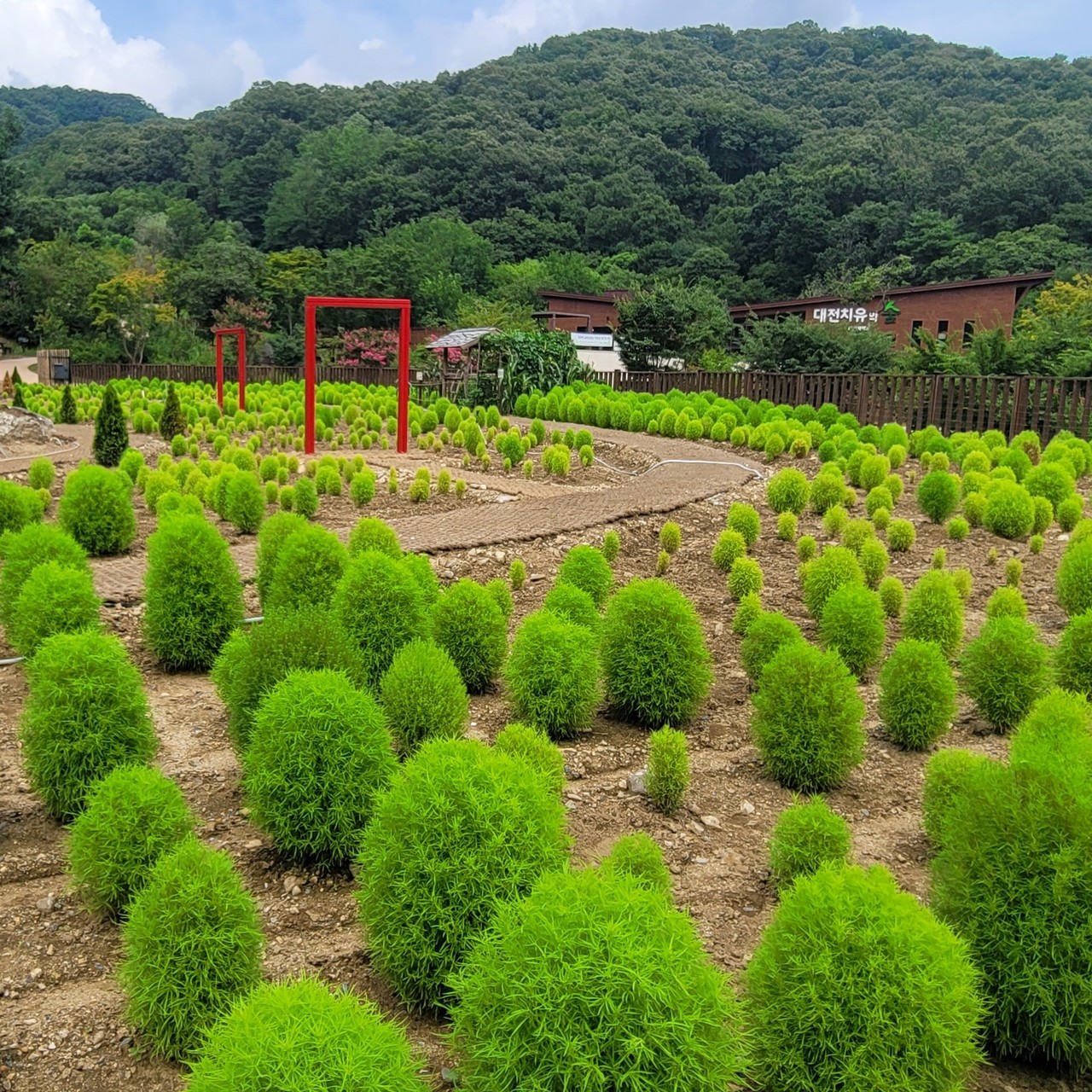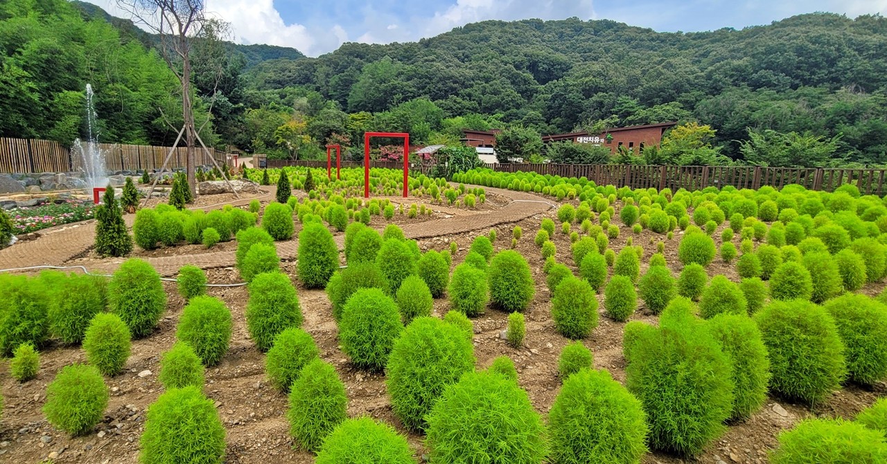 30여 분 걸어 치유의 숲으로 들어간다. 관리센터를 지나면 왼쪽에 울타리로 둘러싸인 공간이 있다. 열린 문 들어가면 시그니처 풍경이 맞이한다. 어느 블로그에서 봤던 공간, 크고 작은 댑싸리가 자리한 정원이다. 맑고 선명한 초록빛 댑싸리가 반갑게 맞아준다. 분수와 조형물까지 아기자기한 포토존이다. 오전 8시부터 오후 5시까지 개방한다. 가을이 되면 붉은 색깔의 옷을 입는다. 가을도 좋겠다.