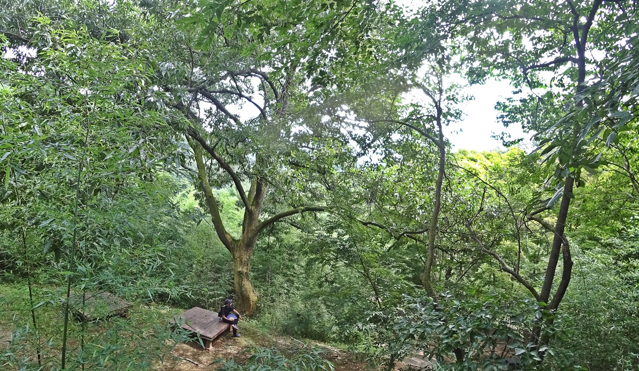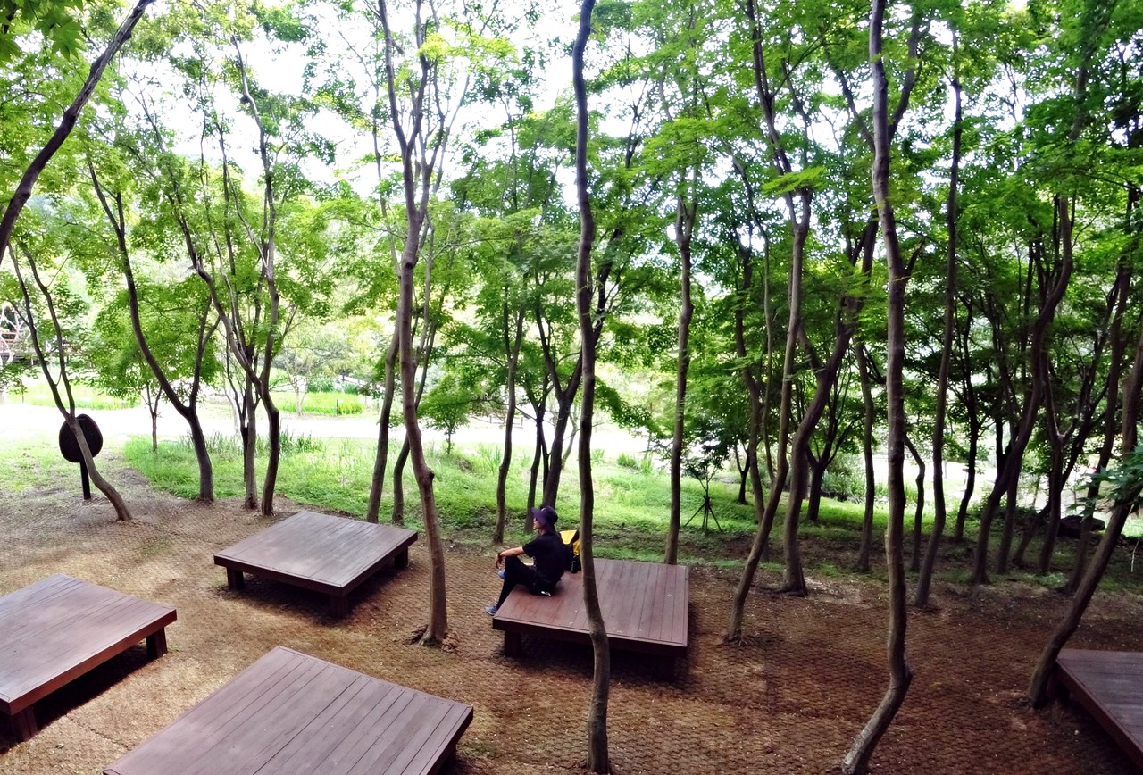‘감성치유원’ 이정표를 따라간다. 맨발숲길과 세족장이 기다린다. 맨발걷기를 즐긴다. 시원한 물로 발을 씻는다. 맨발숲길 반대로 걷는다. 길을 따라가면 데크전망대다. 조망은 솔직히 별로다. 전망대 아래 길을 걷다보니 대숲이다. 모두숲길로 올라탄다. 대숲이 품은 덱길이 걸작이다. ‘괜찮아, 다 잘 될거야.’ 대숲 바람의 위로가 이어진다. 길 아래 풍경이 시선을 잡는다. 커다란 나무 한 그루가 지배하는 원시림 안에 명상을 할 수 있는 너른 평상이 있다. 평상에 앉아 사진 몇 컷 찍고 풍욕장으로 간다.