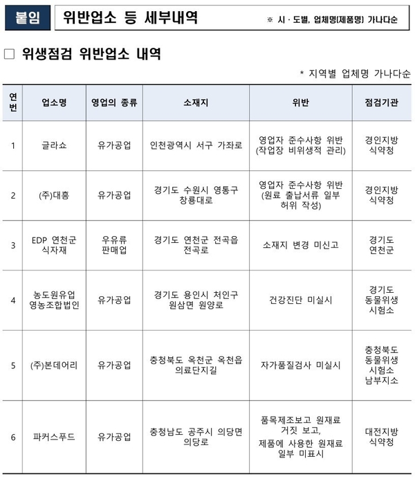 이번 점검에는 영유아가 섭취하는 분유 생산업체와 부적합 이력이 있는 업체도 포함했으며 점검과 함께 유통 중인 유가공품을 수거해 살모넬라 오염 여부 및 잔류물질 등과 영양성분 함량 검사를 실시했다. 주요 위반 사항은 품목제조 거짓보고·원재료 일부 미표시(1곳), 원료 출납서류 일부 허위 작성 등 영업자 준수사항 위반(2곳), 자가품질검사 미실시(1곳), 건강진단 미실시(1곳), 소재지 변경 미신고(1곳)이다.