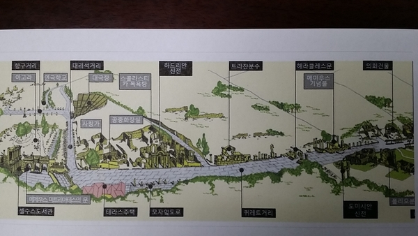 정문인 북쪽 매표소에서 울창한 소나무 숲길을 지나가면, 오른편은 에페소 항구로 통하는 길이고, 왼편은 에페소 유적지로 가는 삼거리이다. 항구로 통하는 아케이드 거리(Arcade Street)는 아르카디우스 황제 때 조성했다고 해서 붙여진 거리명인데, 수많은 상점과 공방이 즐비한 상점가였다. 원형경기장 입구에서 켈수스 도서관 앞까지의 대리석 거리(Marble Street)는 아름다운 대리석으로 포장된 쭉 뻗은 길은 에페소의 메인스트리트다. 2000년 전에 대리석으로 도로를 포장하고 아름다운 문양까지 그린 대리석 거리 양쪽에는 화려한 건물들이 즐비했던 곳이다. 또, 켈수스 도서관과 마제우스와 미트리다테스 문(Gate of Mazeus & Mithridates)은 대리석 거리와 남문 매표소 부근인 의회가 있는 곳까지의 쿠레테스 거리(Curetes Street)를 나누는 기준이 되는데, 쿠레테스 거리는 대리석 거리보다 약간 좁다. 쿠라테스 거리 양쪽으로는 공공건물과 시장이 있었다.