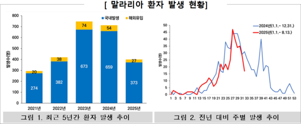 국내에서 올해 첫 말라리아 원충에 감염된 매개 모기가 확인됐다. 질병관리청은 지난달 28일부터 지난 3일 사이 강원 양구에서 채집된 얼룩날개모기에서 삼일열원충 감염이 확인해 19일 전국에 말라리아 경보를 발령했다. 올해 누적 매개 모기 일평균 개체수는 전년 대비 54.4% 줄었으나 지난달 말 집중호우 이후 밀도가 크게 늘어 31주 차(7월 28~8월 3일)엔 평년보다 46.9%, 전년 같은 기간보다 24.1% 증가한 것으로 나타났다. 말라리아 주요 감염 경로는 저녁 시간대 야외 활동으로 땀이 난 상태에서 휴식할 때, 호수공원·물웅덩이 주변 거주 및 산책 중일 때 등이 적잖은 만큼 야간 활동 자제, 긴 옷 착용 및 기피제 사용, 취침 시 모기장 적극 활용 등 예방 수칙 준수가 중요하다.