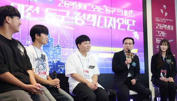박희조 대전 동구청장(오른쪽 두 번째)이 최근 우송대학교에서 지역 고등학생을 대상으로 열린 ‘동구 정책디자인단 정책 경진대회’에서 참가 학생과 꿈과 진로, 지역 현안에 대해 이야기를 나누고 있다.