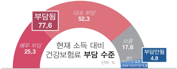 건강보험 급여 확대엔 대체로 긍정적인데 보험료에 대해선 부담을 느끼는 것으로 나타났다. 응답자의 77.6%가 현재 본인이나 가계소득에 비해 건강보험료 수준이 부담된다고 답했다. ‘보통이다’라는 응답은 17.6%, ‘부담되지 않는다’는 응답은 4.8%에 그쳤다.