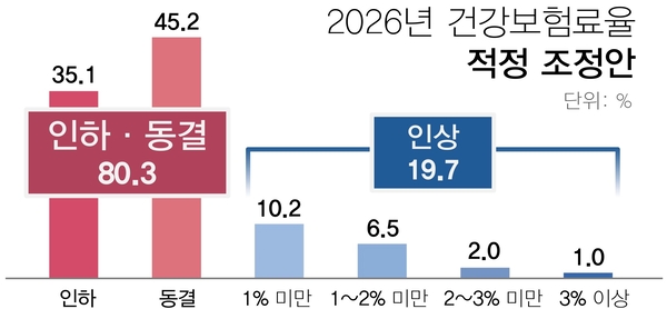내년도 보험료율 결정과 관련해 ‘인하 또는 동결해야 한다’는 응답은 80.3%(인하 35.1%, 동결 45.2%)에 달했다. 2020년 조사 이래 최고치다. 보험료율을 인상해야 한다는 응답은 19.7%였다.