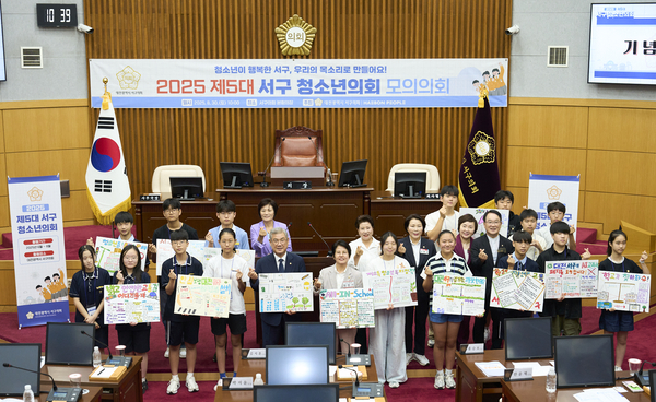 지난 30일 대전 서구의회 본회의장에서 진해오딘 2025년 제5대 서구 청소년의회 모의의회 및 해단식에서 조규식 의장을 비롯한 청소년 의원이 의회의 주요 안건을 소개하며 해단식을 갖고 있다. 청소년의원은 ‘대전 서구 AI 교과서 폐지’ 등 9건의 정책을 제안했다.