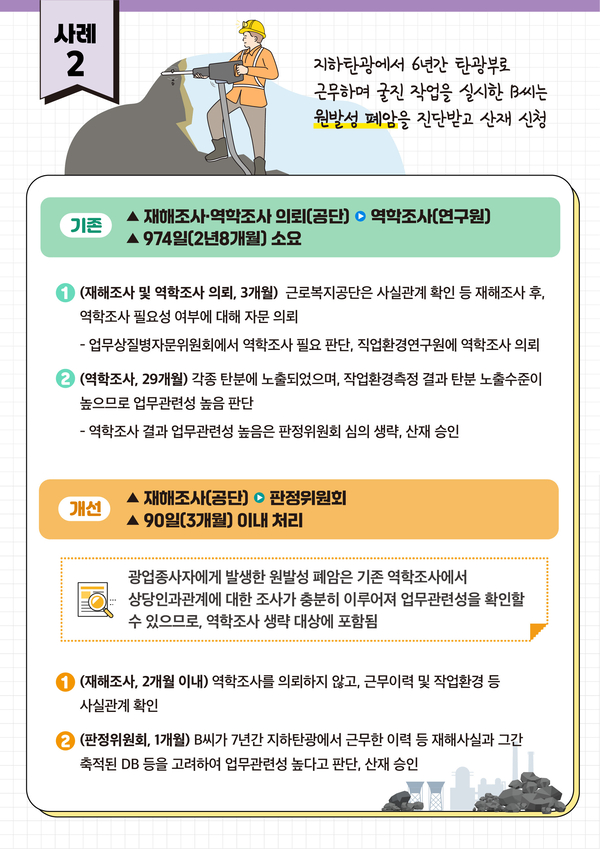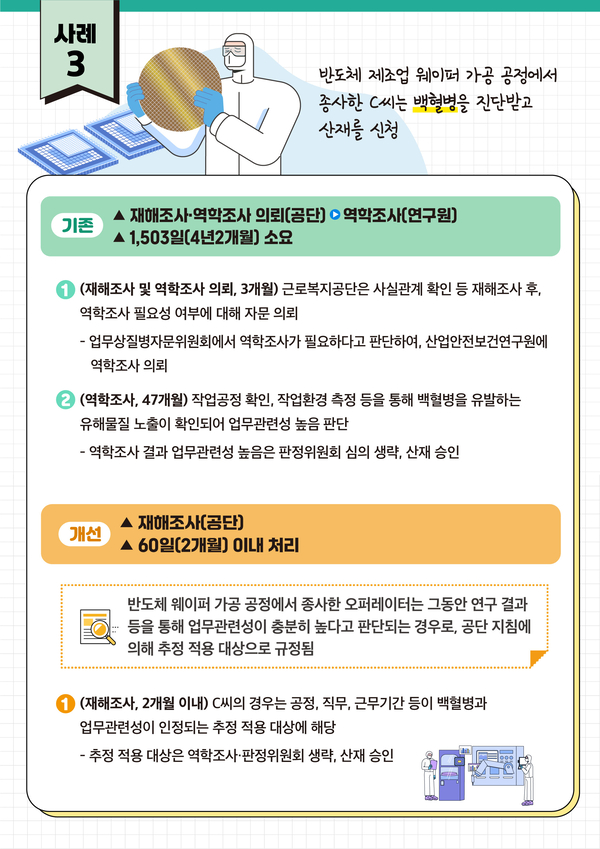 역학조사도 축적된 자료가 충분해 업무상 질병과 유해물질 간 상당한 인과관계를 확인할 수 있는 경우 절차를 생략한다. 광업 종사자의 원발성 폐암, 반도체 제조업 종사자의 백혈병, 단체급식 조리종사자의 조리흄 노출로 인한 폐암과 같이 유해물질과 질병에 대한 충분한 연구가 이뤄져 업무와 질병 사이의 상당인과관계를 확인할 수 있는 경우가 여기에 해당한다. 역학조사는 질병 원인이 분명한 경우 연구기관에서 유해요인, 노출정도 등을 분석해 업무 관련성 여부를 판단하는 것인데 여기에 걸리는 기간은 평균 604.4일에 달한다. 탄광 노동자 A 씨는 작업 중 노출된 유해물질과 폐암 사이의 상당인과관계를 확인하는데 974일의 시간이 소요됐고 반도체 제조업공장 웨이퍼 가공 업무에 종사한 B 씨가 백혈병에 걸려 산재를 신청한 사례에서도 작업 공정에서 발생한 벤젠 등 발암물질과 백혈병 사이의 상당인과관계를 확인하는데 1503일이 걸렸다. 역학조사가 생략되면 조해조사를 거쳐 60일 내 산재 인정이 가능하다.
