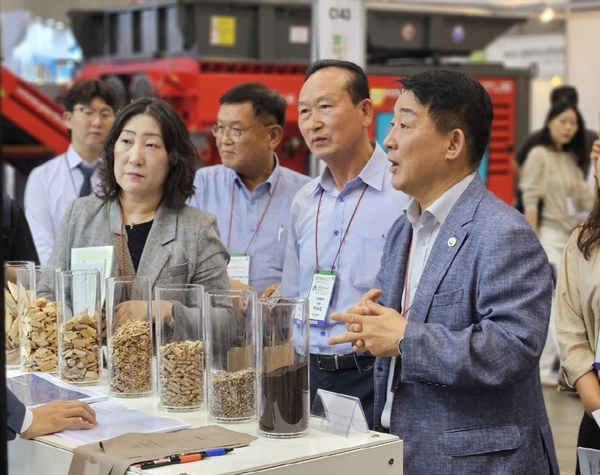 서철모 대전 서구청장(오른쪽)이 최근 경기 고양 킨텍스에서 열린 ‘제18회 폐기물·자원순환 산업전(RETECH2025)’을 찾아 폐기물 처리 및 자원재활용 기술을 살피고 있다.