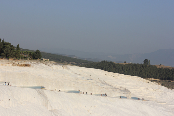 히에라폴리스에서 암벽 사이에서 자연적으로 용출된 온천수는 수십 개의 계단식 논처럼 물웅덩이를 만들면서 절벽 아래로 흘러내린 하얀 결정체가 멀리서 보면 목화꽃과 같다고 해서 목화의 성이라는 별칭이 붙은 것인데, 고대도시 유적과 사이는 돌을 깔아서 구분했다. 온천수 웅덩이는 1988년 유네스코 세계유산으로 등재되기 전까지 일반인들이 온천욕과 수영을 했으나, 지금은 수영을 금지하고 발만 담글 수 있다. 그런데도 수영복을 입은 관광객들이 많다. 이 물은 칼슘과 이산화탄소를 다량 함유하여 튀르키예에서 유명한 카펫과 비단 표백제로 널리 사용된다고도 하는데, 산 아래에는 절벽에서 흘러내린 온천수를 저장한 거대한 일반수영장이 있다. 수영장에는 아름다운 꽃이 피어있고, 음료수며 기념품을 파는 유원지 분위기다. 수영장의 수심도 1m~2m 정도로 얕아서 걷는 것이 불편한 노약자나 어린이들에게 인기다. 수영장 길 건너에 호텔이 있기 때문이다. 호텔에 돌아와 노천 수영장에서 몸을 씻고 피로를 풀었는데, 호텔 곳곳에 로마 시대의 항아리며 유물들을 장식처럼 설치해 둔 것이 매우 인상적이다. 파묵칼레에도 카파도키아처럼 열기구를 띄우고 있지만, 그다지 호기심이 발동하지 않아서 눈 구경만 했다.