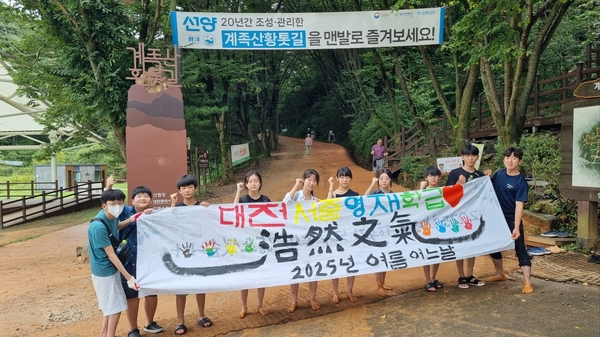 내가 먼저 신발과 양말을 벗고 독려한 것이 도움이 되었는지 학생들이 하나, 둘 용기를 내어주었다. 끊임없이 재잘재잘거리는 학생들과 걷다보니 어느덧 중턱에 마련된 휴식 공간에 도착했다. 마련된 나무 데크 위에 둥글게 모여 앉아 학생들과 방학 동안 지낸 이야기를 나누었다. 쓰레기를 줍고 내려오는 길에는 선양 소주 회장님을 마주쳤다. 평일에 학생들이 걷고 있는 모습이 신기했는지 어느 학교에서 왔는지 물어보셨다. 유○○ 학생이 “대전서중학교에서요~~!!”라고 크게 대답해 드렸다.