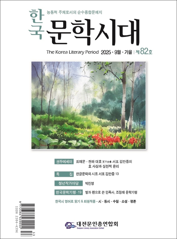 대전문인총연합회(회장 김명순·대전문총)가 ‘한국문학시대’ 2025년 가을호(제82호)를 발간했다. 이번 호에서도 서포 김만중을 현대로 불러왔다. 대전이 본향인 김만중의 문학적 정통성을 잇고자 노력하고 있는 점이 눈에 띈다. ‘한글문학의 시조 서포 김만중’을 주제로 신효경(고려대 강사)의 ‘서포 문학의 환상성과 문학적 가치’, 김명순 회장(시인)의 ‘대전, 한글문학의 효시 서포 김만중을 품다’를 13번째 특집으로 선보였다. 5년째 서포 김만중을 특집으로 이어가고 있다.