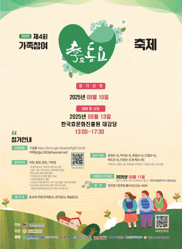 한국효문화진흥원이 주최하고 대전중구문화원이 주관하는 ‘2025 제4회 가족참여 효동요 부르기 대회’가 13일 오후 1시부터 한국효문화진흥원 대강당에서 개최된다.