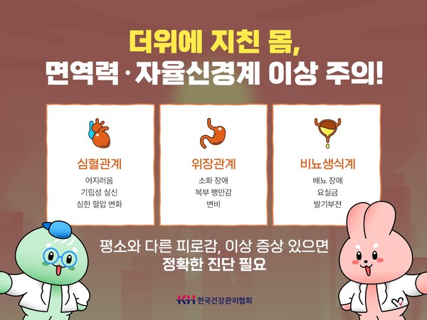 KH한국건강관리협회 대전충남지부 노은중 원장은 “계속되는 늦더위는 신체의 자율신경계 균형을 깨뜨리고 면역력 저하를 유발할 수 있습니다”며, “만성 피로나 두통, 소화불량, 집중력 저하 등을 경험하는 분들이 많아지는 시기인 만큼, 건강 신호에 귀 기울이고 사전 예방적 건강관리에 힘써야 합니다”고 말했다.