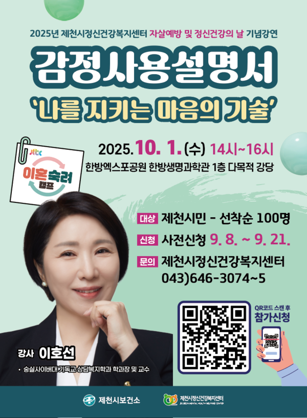 강연은 시민 누구나 참여할 수 있으며 오는 21일까지 제천시정신건강복지센터 누리집 또는 홍보물 내 큐알(QR)코드를 통해 사전 신청하면 된다.