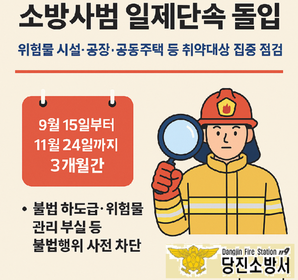 당진소방서(서장 이상권)는 재난대응과 주관으로 9월 15일부터 11월 24일까지 약 3개월간 ‘2025년 하반기 소방사범 일제단속’을 실시한다. 이번 단속은 화재 발생 시 대규모 피해가 우려되는 화재취약시설을 중심으로 무허가 위험물 저장, 불법 하도급 및 부실 감리 등 각종 위법 행위를 불시단속을 통해 근절하는 데 중점을 둔다.