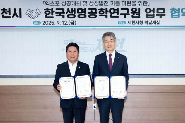 충북 제천시와 한국생명공학연구원은 천연물 중심의 바이오산업 발전과 상호 동반성장을 위한 업무협약(MOU)을 체결했다.