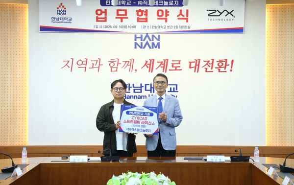 16일 한남대학교와 ㈜직스테크놀로지가 공동연구 개발 및 전문인력 양성을 위해 손을 맞잡은 가운데 이승철(오른쪽) 총장과 엄신조 대표이사가 협약서를 교환하고 있다. 이번 협약에 따라 직스테크놀로지는 한남대에 직스캐드 전문가 버전 교육용 라이선스를 연간 500copy씩 3년간 총 1500copy(약 10억 원 상당)를 기증하고 기술지원 및 교육지원을 제공하기로 했다. 또 양 기관은 학생들의 현장 실습 프로그램 공동 연구, 소프트웨어 개발 협력, 국가 과제 공동 참여 등을 통해 교류를 확대할 계획이다.