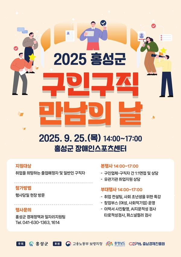 홍성군은 25일 장애인스포츠센터에서 일자리 지원 프로그램 ‘구인·구직 만남의 날’을 개최한다.