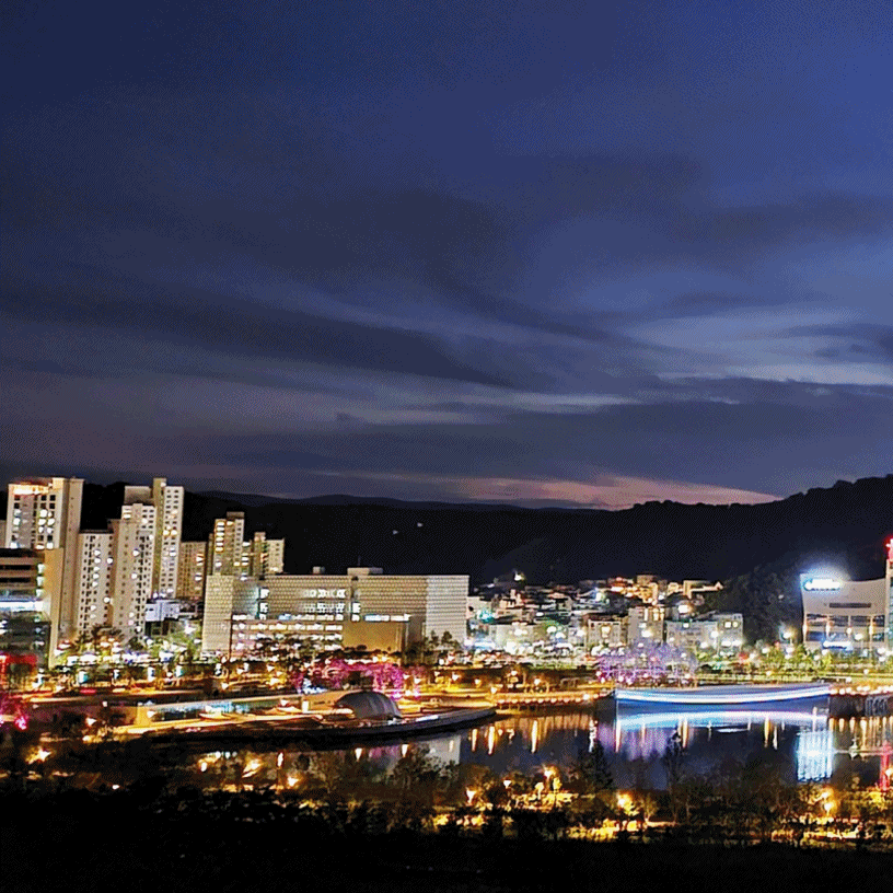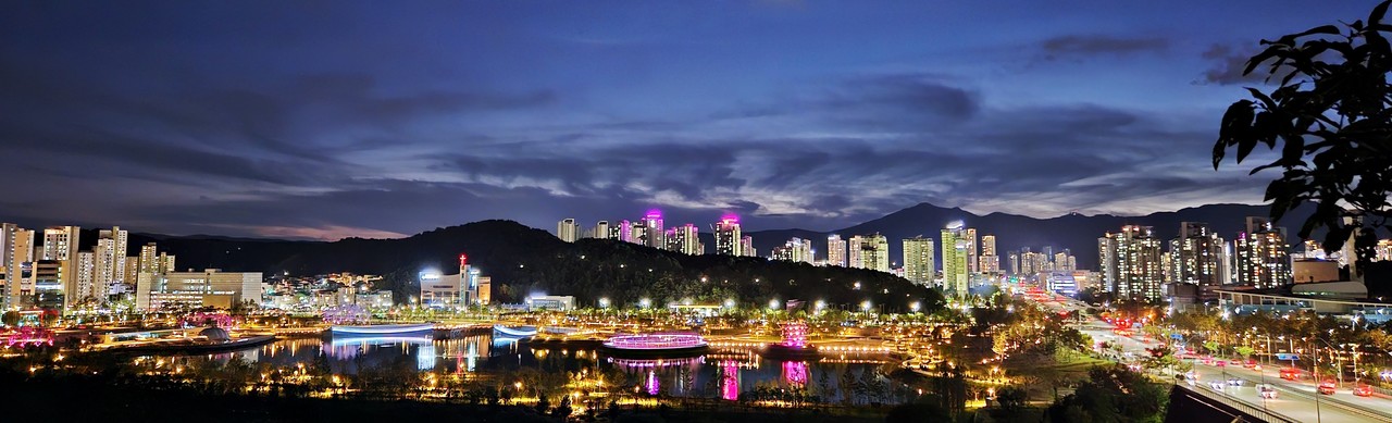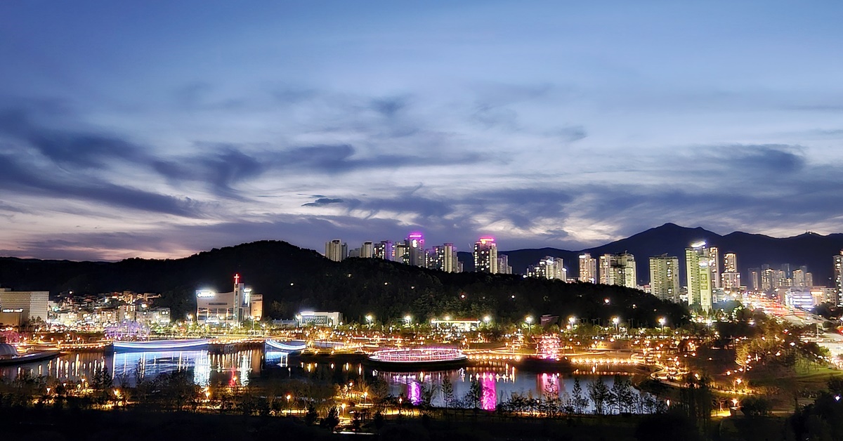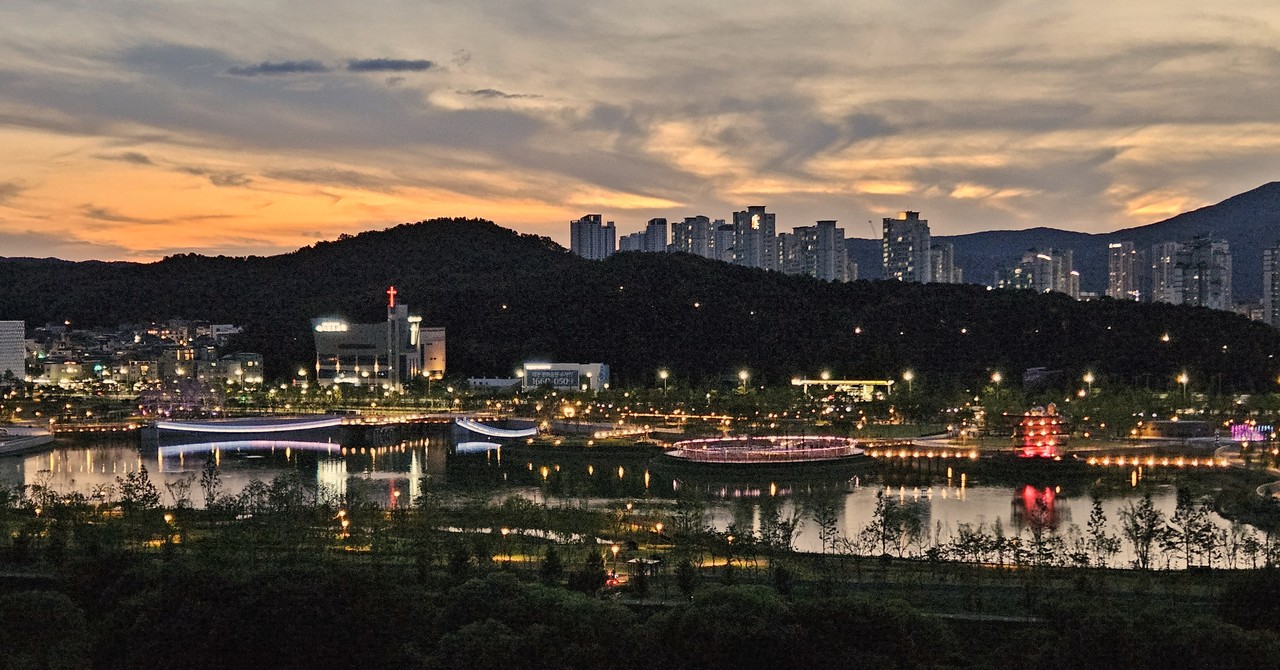 10여 년 우여곡절 끝에 드디어 개장식을 앞둔 대전 갑천생태호수공원. 27일 개장을 앞두고 도시의 빛과 어우러져 화려한 빛을 발산하고 있다. 부디 사람, 도시, 자연을 품는 이로운 빛이 되길 기대한다.