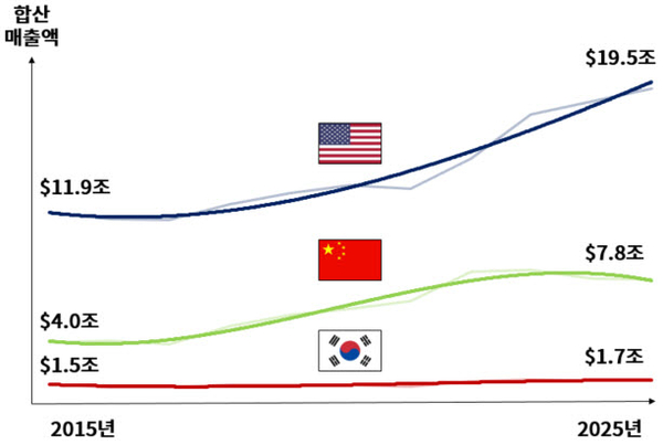 23일 대한상공회의소가 내놓은 ‘글로벌 2000대 기업의 변화로 본 한·미·중 기업삼국지’ 보고서에 따르면 글로벌 2000에 속한 미국 기업은 10년 전(2015년) 575개에서 현재 612개로 늘었다. 그사이 중국은 180개에서 275개로 폭증했다. 반면 한국은 66개에서 62개로 되레 줄었다. 중국 기업생태계에 ‘신흥 강자’들이 대거 출현하면서(10년간 52.7% 증가) 지구촌의 판도를 바꾸고 있다.