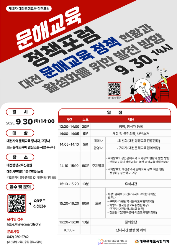 대전평생교육진흥원이 오는 30일 오후 2시 컴퍼런스홀에서 ‘2025년 2차 대전평생교육정책포럼’을 개최한다. 포럼 주제는 ‘대전시 문해교육 정책 현황과 활성화를 위한 발전 방향’이며 . 변종임 국가평생교육진흥원 평생교육정책본부장, 전성하 청춘학교 교장의 주제발표 등으로 진행된다. 종합토론에선 문해교육 활성화를 위한 각계각층의 제안이 이어질 예정이다.