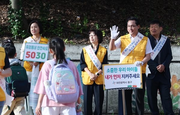 박희조 대전 동구청장(앞줄 오른쪽)이 최근 용운초등학교 인근 등굣길 교통안전 캠페인을 벌이고 있다. 박 청장과 용운초 관계자, 녹색어머니회원 등은 횡단보도 통행, 정지선 준수, 제한속도 준수 등을 홍보했다. 박 청장은 이후 어린이보호구역 노면 상태를 점검했다.