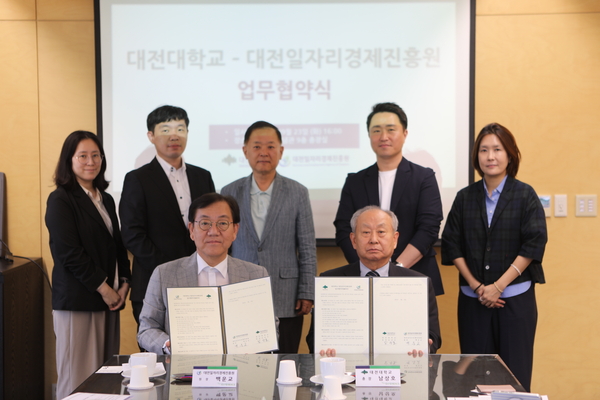 대전대학교와 대전일자리경제진흥원이 지역 정주형 전문 인재 양성 및 지역사회 발전을 위한 업무협약을 체결한 가운데 남상호 총장과 커뮤니케이션디자인학과 교수진, 대전일자리경제진흥원 관계자들이 기념촬영을 하고 있다. 협약의 내용은 지역 인재 양성, 산학 연계 공동사업 발굴, 학생 현장실습 및 취업지원, 지역 문화예술 콘텐츠 개발 협업 등이며 내달 개최되는 ‘2025 오!대전’ 도시 브랜드 전시회를 공동 주관해 지역 대학 중심의 문화·예술 콘텐츠 개발에 협력할 예정이다.