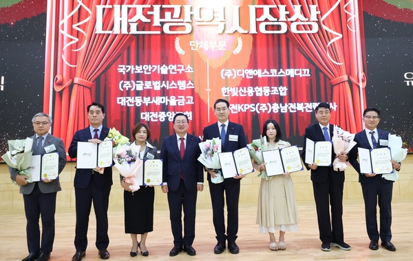 24일 건양대학교 죽헌정보관에서 2025년 나눔실천 유공자 포상식이 열려 이장우 대전시장(왼쪽 네 번째)이 이웃사랑과 나눔 문화 확산에 앞장선 개인·단체 40여 명에게 표창을 수여하고 있다. 행사에서는 대전시장 표창을 비롯해 대전시의회 의장상·대전시교육감상·사회복지공동모금회장상 등도 함께 전달됐다.