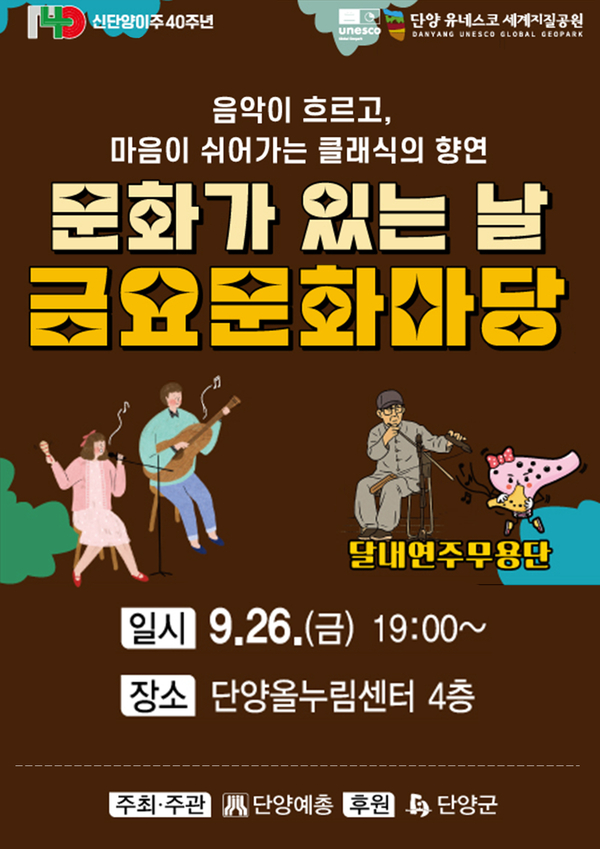 충북 단양군은 26일부터 12월까지 매월 마지막 금요일 저녁 올누림센터 4층 강당에서 ‘문화가 있는 주간 금요문화마당’을 운영한다고 25일 밝혔다.