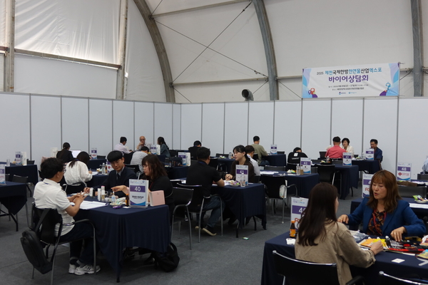 2025제천국제한방천연물산업엑스포 산업관에서 열린 국내바이어상담회 첫날, 홈쇼핑·온라인몰·백화점 등 주요 유통사와 기업들이 1대1 상담을 이어가며 실질적인 판로 개척 기회를 모색하고 있다.