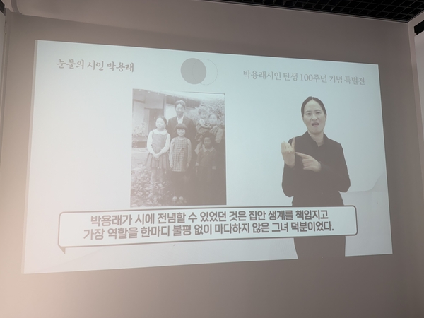 전시를 보기 위해 찾아간 대전문학관, 전시하는 곳을 찾지 못해 헤맸다. 한쪽 벽을 보니 안내판이 있어 확인 후 엘리베이터를 타고 전시장으로 올라갔다. 전시장에 들어서자 가장 먼저 환한 미소를 머금은 안내원이 다가왔다. 그는 조용히 화이트보드를 앞으로 내밀었다. 화이트보드에는 ‘전시를 관람하기 위해 왔어요’, ‘수어 통역 해설이 필요해요’라는 문구가 붙어 있었다. 그는 일반 안내원이 아닌 수어 전시 해설자였다. 전시 관람을 하기 위해 왔다고 하니 자연스럽게 박용래 시인과 전시에 관련된 화면·음성해설을 진행하는 곳으로 안내를 받았다. 해당 전시 화면을 통해 수어 통역사, 자막, 음성해설이 적절하게 어우러져 전시를 설명했다. 해당 전시뿐만 아니라 모든 작품 아래에는 큐알코드가 있어 누구든지 작품에 대한 설명을 편하게 볼 수 있었다. 또 점자블록, 촉지 안내판, AR글라스, 음성안내 이어폰 등이 마련돼 있어 장애인·비장애인 모두 전시를 즐길 수 있었다.