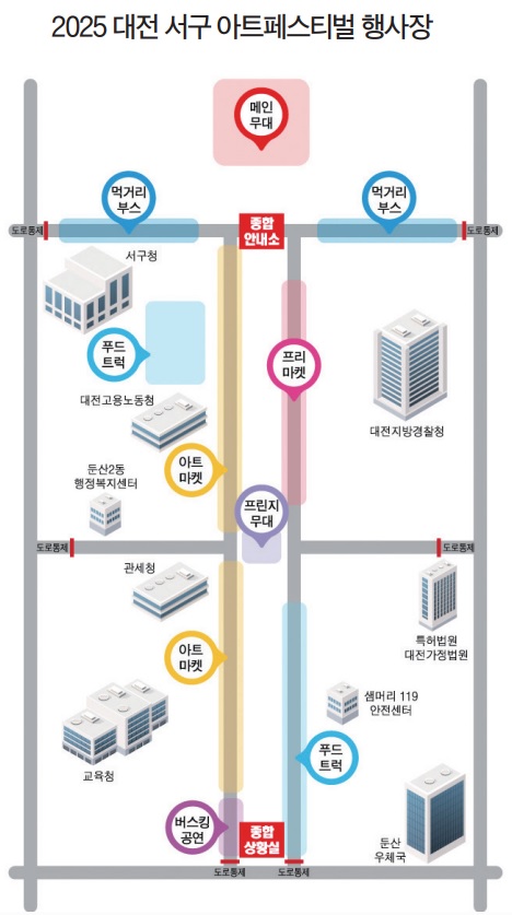 1년 만에 다시 돌아온 서아페를 관통하는 키워드는 야간 체류다. 그 중심에는 아트빛터널이 있다. 관객이 걸음을 옮길 때마다 공원의 새로운 모습이 펼쳐진다. 단순한 장식이라기 보단 살아 숨 쉬는 전시실이 더 맞는 표현일지 모르겠다. 30일 전부터 설치돼 축제가 끝난 뒤에도 30일 동안 남아 있는 이 터널은 기대와 여운을 한 달 넘게 이어가는 장치다. 밤이 되면 공원은 여행의 얼굴을 띤다. 낮에 아이가 만들던 목공 도마가 조명을 받아 그림자가 되고 과학 실험에서 남긴 흔적이 또 다른 전시물이 된다. 아이들의 낙서는 포토존으로 다시 태어나고 부모의 미소가 그 옆에 빛처럼 겹쳐진다. 공원 밖으로도 여정은 뻗어 나간다. 대전시립미술관, 이응노미술관, 대전예술의전당, 대전시립연정국악원으로 이어지는 서구아트투어는 도시의 문화시설을 엮고 전통시장과 골목 명소까지 끌어안는다. 외국인 관광객도 이 동선 속에서 도시 전체를 하나의 거대한 무대로 경험한다. 서구청 광장으로 확장된 먹거리존은 돗자리를 깔고 앉아 음악과 함께 즐기는 밤의 식탁이 된다. 배달존은 인근 상권을 살리고, 파라솔과 다회용기는 오래 머물고 싶은 환경을 만든다. 공원은 이제 머물고 싶은 여행지가 된다.