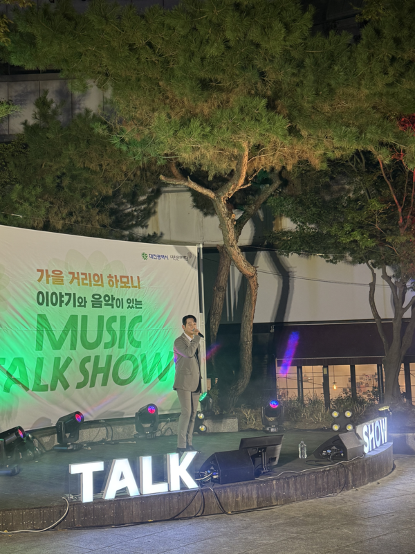 대전문화재단은 지난 11일 둔산동 타임로 광장에서 700여 명의 시민이 참여한 가운데 뮤직토크쇼 다섯 번째 무대를 성황리에 마무리했다. 이번 공연은 시민들이 일상 속 가까운 공간에서 수준 높은 음악을 즐길 수 있도록 마련된 토크콘서트 형식의 무대로, 도심 한가운데에서 클래식과 대중음악이 어우러진 특별한 시간을 선사했다. 1부는 ‘수요브런치콘서트’ 등 다양한 무대에서 호흡을 맞춰온 지역 대표 클래식 듀오 김상균&홍소림이 꾸몄으며 하모니카와 기타의 따뜻한 앙상블이 도심 속 가을밤의 정취를 한층 더했다. 2부에는 ‘발라드의 황태자’로 불리는 가수 테이가 출연해 ‘사랑은 향기를 남기고’, ‘같은 베개’, ‘착한 사랑’ 등 대표 히트곡을 열창해 시민들의 뜨거운 호응을 얻었다. 백춘희 대전문화재단 대표이사는 “대전문화재단은 앞으로도 시민들이 지역 곳곳에서 문화예술을 향유할 수 있도록 다양한 사업을 지속적으로 추진하겠다”며, “이러한 무대를 통해 지역 상권에도 활기를 불어넣고 상인들에게 도움이 되기를 기대한다”고 말했다.