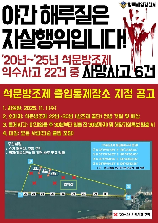당진시(시장 오성환)는 ‘연안사고 예방에 관한 법률’에 근거해 11월 1일부터 석문방조제 22~30번 구간에 대한 야간 출입 통제를 실시한다고 14일 밝혔다.