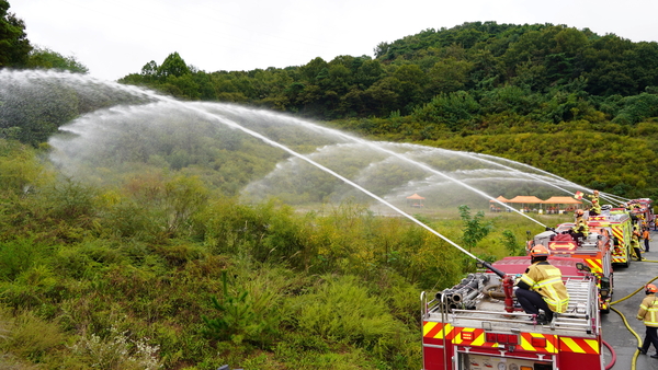 충청권 4개 시·도소방본부가 14일 해밀동 원수산 일원에서 도시형 산림화재 대응 합동훈련을 진행하고 있다. 이날 훈련은 가을철 건조한 기후와 강풍으로 산림화재의 도심 주택단지 확산 상황을 가정해 이뤄졌으며 각 소방본부는 소방차와 레미콘, 살수차 등 24대 차량, 드론, 이동식 수조를 투입해 재난대응 체계 운영능력을 점검했다.
