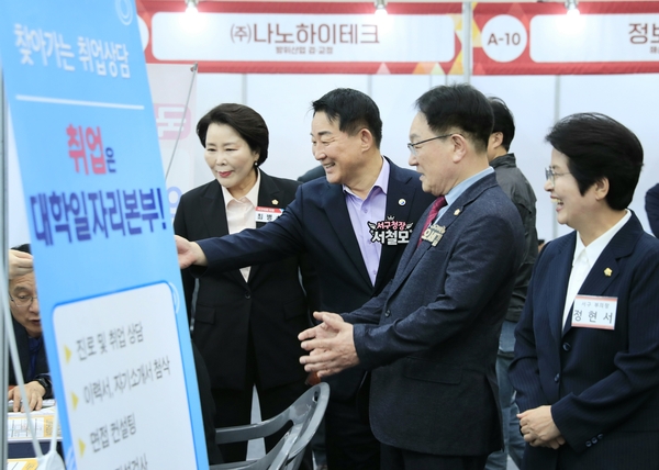 서철모 대전 서구청장(왼쪽 두 번째)이 최근 갈마복합커뮤니티센터에서 열린 ‘2025년 하반기 대전 서구 굿잡(JOB) 일자리박람회’에서 기업 관계자를 격려하고 있다. 이날 박람회에 18개 기업의 현장 면접과 50개 기업의 채용 게시대를 통한 간접 채용이 진행됐으며 217명의 구직자가 현장 면접에 참여해 29명이 취업했다.