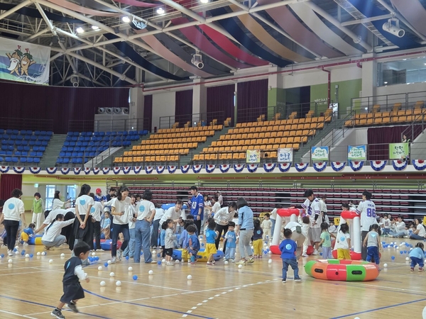금산군어린이집연합회(회장 김정순)는 지난 15일 금산종합체육관에서 관내 21개소 어린이집 영유아, 보육교직원, 학부모 약 600명이 함께하는 제9회 금산군 어린이집 연합 체육대회를 개최했으며 이 자리에 참여한 아이들의 웃음꽃이 활짝 피어났다.