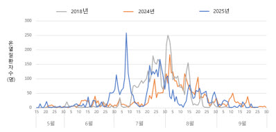 전체 온열질환자의 29%(1295명)가 7월 하순에 발생했으며 사망자도 7월 하순에 전체 사망자(29명)의 34.5%(10명)가 집중적으로 발생했다. 2025년 7월 하순 평균 최고기온은 33.9도로 전년(32.1도) 대비 1.8도나 높았다. 올여름 온열질환자가 가장 많이 발생한 날은 7월 8일로 259명이었으며 이날 평균 최고기온은 34.1도였다. 이어 7월 28일 167명(34.9도), 7월 22일 147명(32.7도) 순이다.