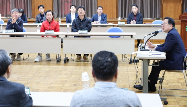 20일 이장우 대전시장(오른쪽)이 옛 충남도청에서 관내 전통시장 28곳의 상인회장들과 간담회를 열고 전통시장 활성화 방안과 상인들의 애로사항을 청취하는 시간을 갖고 있다. 간담회에서는 농축수산물 환급행사 등 전통시장 활성화를 위한 다양한 대책이 중점적으로 다뤄졌다. 대전시는 전통시장 상권 회복을 위해 적극적인 지원을 약속했다.