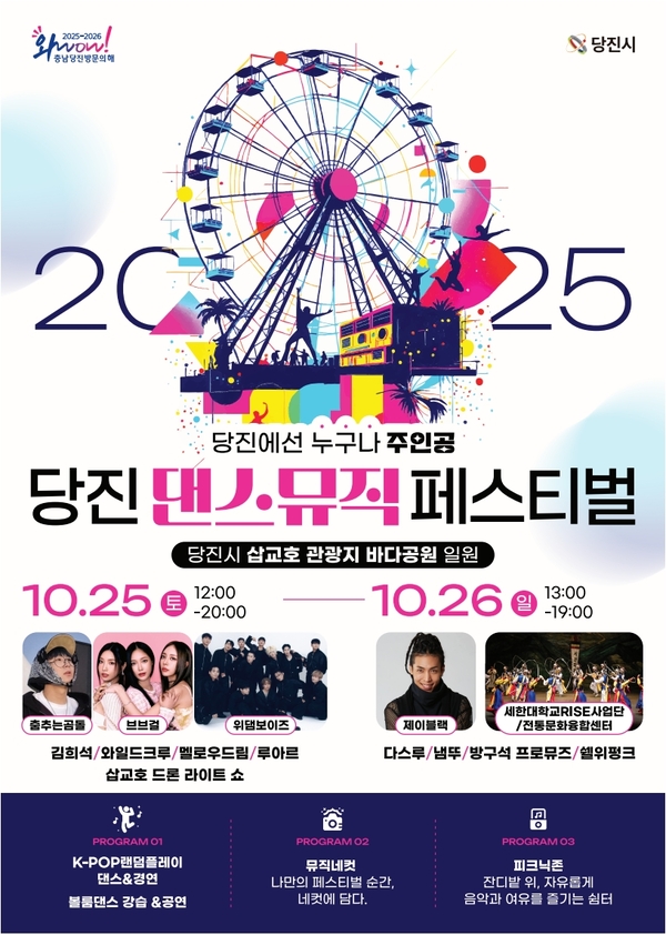 당진시(시장 오성환)가 오는 25일과 26일 이틀간 삽교호 관광지 바다공원 일원에서‘2025년 당진 댄스&뮤직 페스티벌(DDMF)’을 개최하며, '춤과 음악으로 하나 되는 당진, 당진에선 누구나 주인공'이라는 주제로 화려한 가을 축제의 장을 펼친다.
