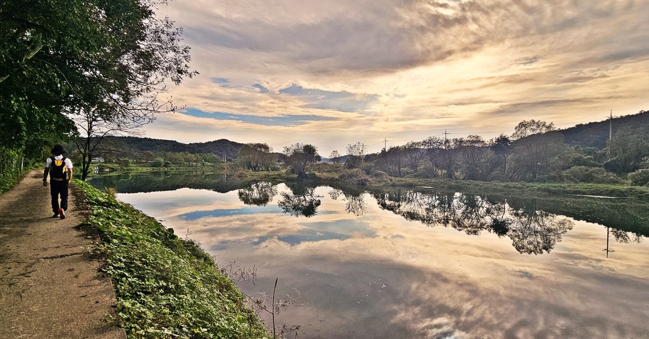 사진 속 저 길을 걷고 있다. 갑천 물길 바로 옆이다. 수면이 고요하다. 흐르고 있다기보다 머문 물길처럼 보인다. 자전거 타고 지나가다가도 멈추게 되는 곳이다. 서성이는 발걸음, 수면 위 데칼코마니에 마음이 동한다. 자연은 흉내낼 수 없는 예술작품이라고 그랬던가. 독보적이다.