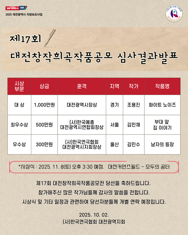 대전 창작희곡작품 공모전은 대전시의 지방보조금 지원 사업으로 진행되며, 선정된 수상작 3편의 저작권은 3년간 대전연극협회가 보유한다. 협회는 이를 기반으로 지역 극단들과의 협업을 통해 공연 제작을 추진하며, 대전의 신규 연극 레파토리 발굴에 박차를 가할 계획이다. 시상식은 오는 11월 8일 오후 3시 30분, 대전 커먼즈필드 ‘모두의 공터’에서 개최될 예정이다.