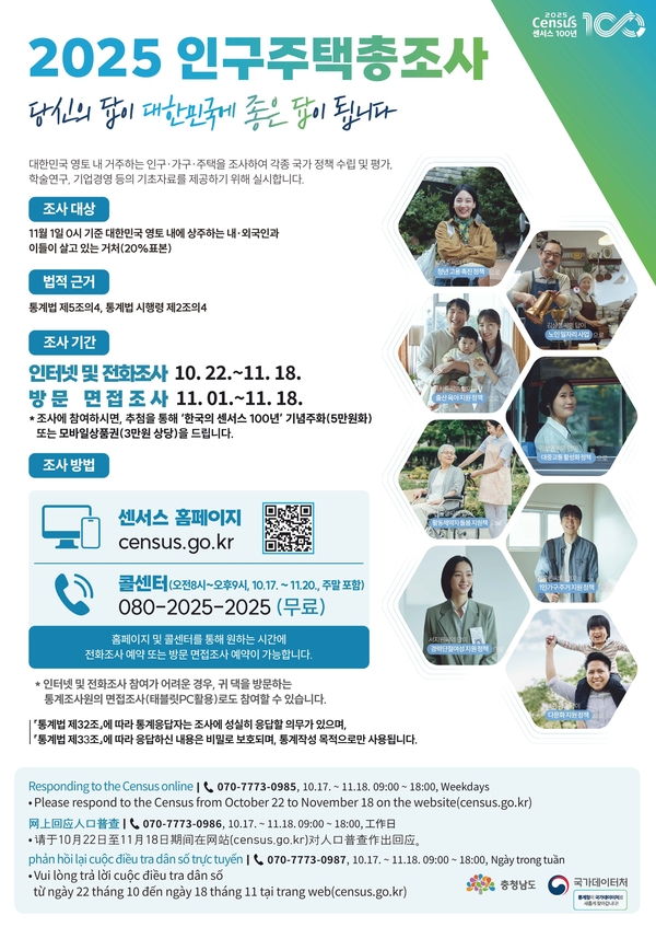 충남도는 22일부터 11월 18일까지 ‘2025 인구주택총조사’를 실시한다.