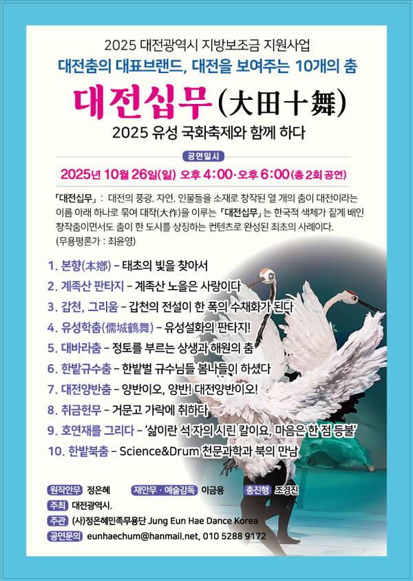 정은혜 민족무용단이 주관하는 ‘대전십무(大田十舞)’가 오는 26일 유림공원에서 진행된다. 대전십무는 대전의 풍광, 자연, 인물들을 소재로 독창적인 춤 예술로 승화시킨 열 개의 작품을 말하며, 한국적 색채가 짙은 창작품이면서 춤이 한 도시를 상징한 최초의 사례라는 평가를 받고 있다.