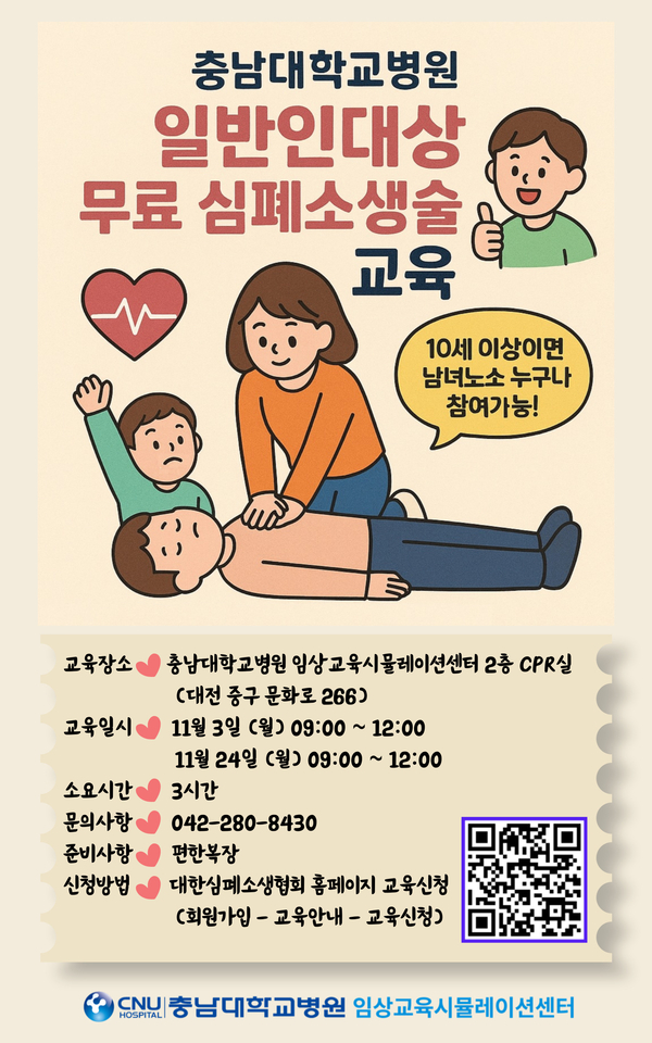 충남대학교병원 임상교육시뮬레이션센터는 지역사회 응급대처 역량 강화를 위해 내달 3일과 24일 두 차례에 걸쳐 무료 심폐소생술(CPR) 교육을 실시한다.