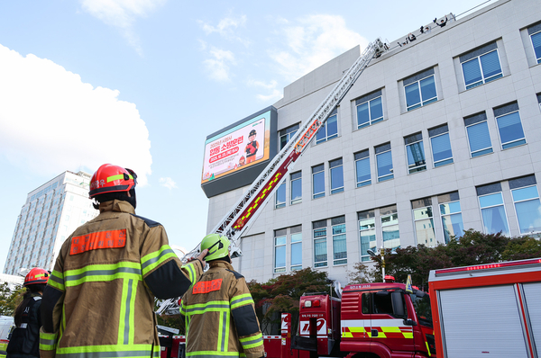 훈련은 본청 4층 대강당에서 화재가 발생한 상황을 가정해 화재신고 및 상황전파, 초기진화·대피유도, 부상자 구조 와 환자이송, 소방서의 본격 진압과 인명구조 순으로 진행됐다. 소방펌프차와 고가사다리차, 구급차 등 장비 8대가 투입돼 실전과 같은 대응 절차를 점검했다.