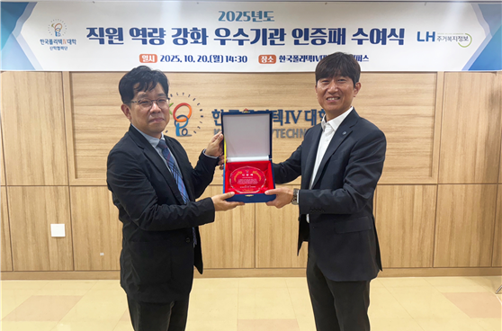 한국폴리텍Ⅳ대학 대전캠퍼스에서 열린 ‘2025년도 직원역량강화 우수기관 인증패 수여식’에서 LH주거복지정보가 우수 훈련 참여기업으로 인증받았다. 이번 인증은 LH주거복지정보가 직원들의 직무역량 강화를 위해 지속적으로 교육에 참여하고 우수한 성과를 달성한 것을 인정받은 결과다.