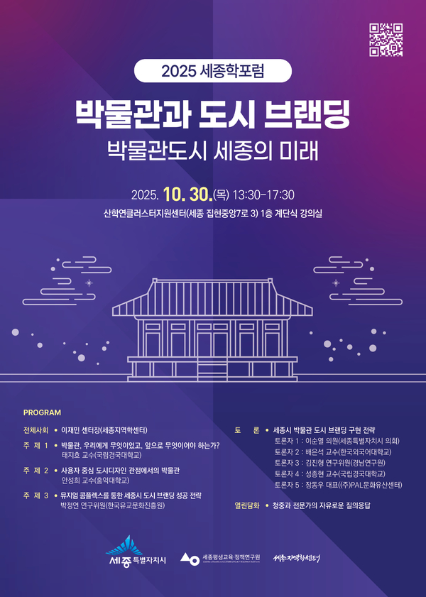 세종시가 오는 30일 집현동 산학연클러스터지원센터에서 박물관도시 세종의 도시정체성 구현 전략을 논의하는 ‘2025 세종학포럼’을 개최한다.