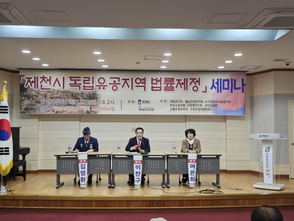 이날 세미나는 충북도청과 제천발전위원회가 주최하고 제천시 보훈단체협의회 8개 단체(재향군인회, 월남전참전회, 6.25참전국가유공자회, 무공수훈자회, 고엽제전우회, 상이군경회, 전몰군경유족회, 전몰군경미망인회)가 공동으로 주관해 개최했다.