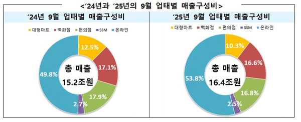 29일 산업통상자원부가 내놓은 ‘2025년 9월 주요 유통업체 매출 동향’(오프라인 13개사, 온라인 10개사)에 따르면 지난달 국내 주요 23개 유통업체 매출은 전년 동월 대비 7.7% 증가한 16조 4000억 원으로 집계됐다. 온라인 매출은 16.5% 뛰었지만 오프라인 매출은 1% 감소했다.