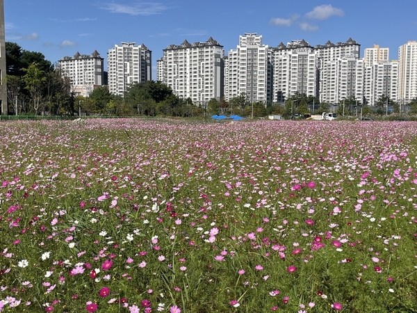 대전 서구가 최근 도안동 131-1 일원 갑천 친수구역 유휴부지에 조성한 꽃 정원에 코스모스가 만개한 모습. 구는 해마다 대규모 꽃 정원을 조성하며 도심 경관을 개선하고 주민들에게 새로운 볼거리를 제공하고 있다.